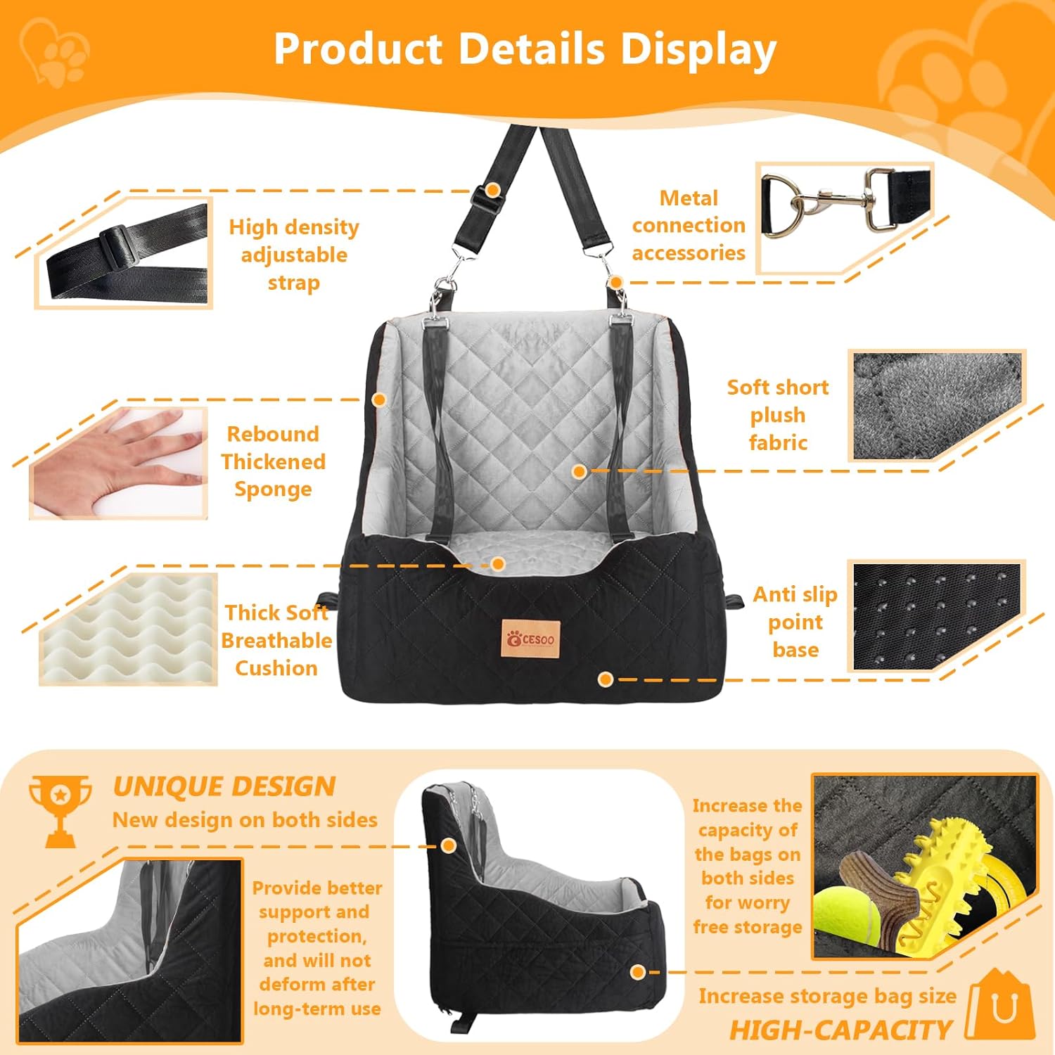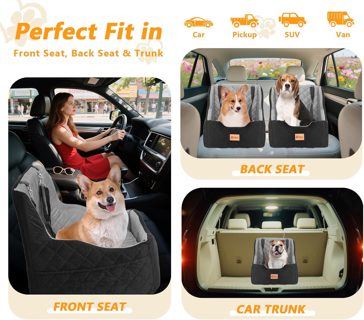 - After Multiple Security Tests - The Car seat for dogs with dog leashs and top safety strap has undergone new exterior design, We conducted multiple safety tests, including start stop brake, emergency brake, and sharp turns. The results indicate that our pet car seats perform better in terms of practicality and safety than commonly seen dog booster seats on the market.