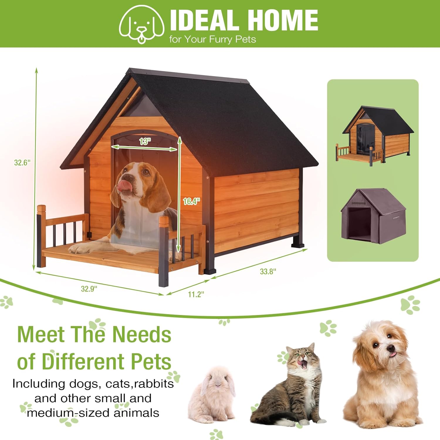 - SPACIOUS SPACE FOR MULTI BREEDS:Measuring 45in(L)Ă—32.9in(W)Ă—32.6in(H) with a roomy entrance of 16.4in(H)Ă—14in(W), our Dog House is perfectly sized for small and medium dogs. Suitable for both indoor and outdoor use, it's the perfect Puppy Shelter for any family pet