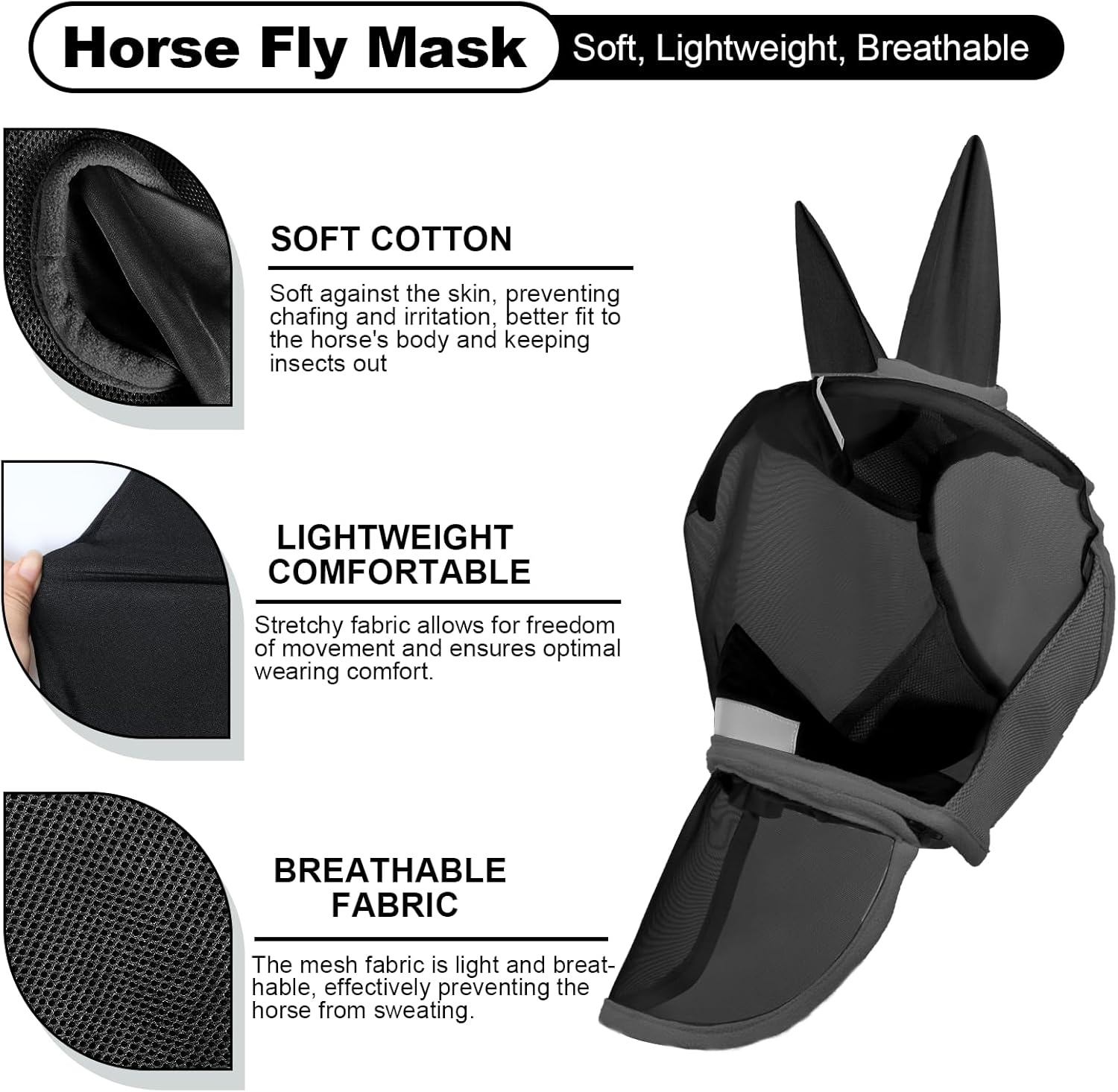 - 【Nighttime Reflective Strips & Ergonomic Protection Structure】 Fly masks for horses with ears and nose feature forehead/nose reflective strips for nighttime visibility. Double-Dart Stitching keeps our horse fly mask away from eyes, while 13-inch ear covers and a three-hole cap balance protection and vision. Whether a yearling fly mask or draft horse fly mask, our equine fly masks prioritize safety through ergonomic design.