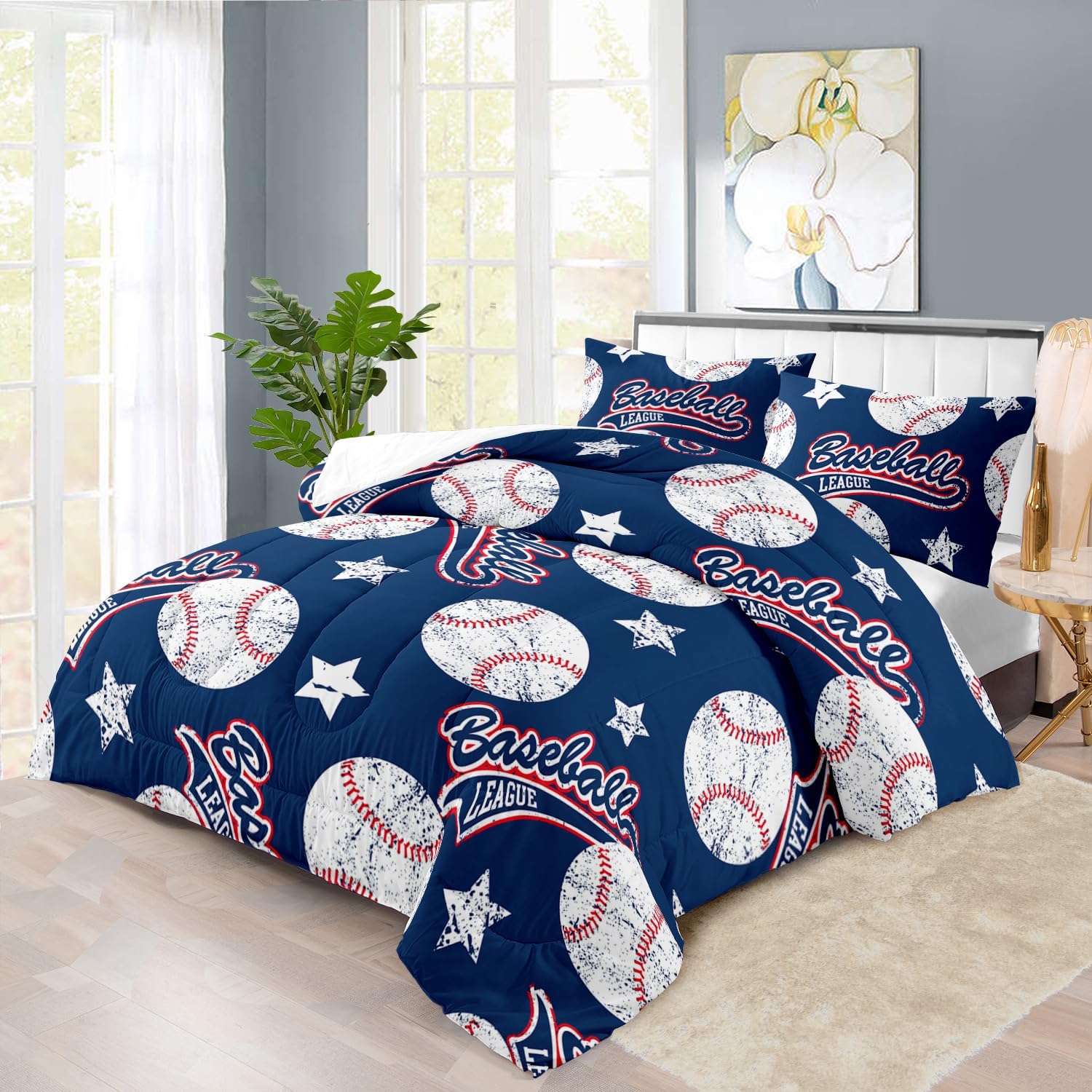 - King Size Baseball Comforter Set :This bedding set includes 1 comforter(67" x 85") and 2 pillowcases(20”x30”). In order to facilitate transportation, the quilt is made of vacuum compression technology. It will be slightly wrinkled when taken apart, but it will quickly regain its fluffiness if you gently beat it.