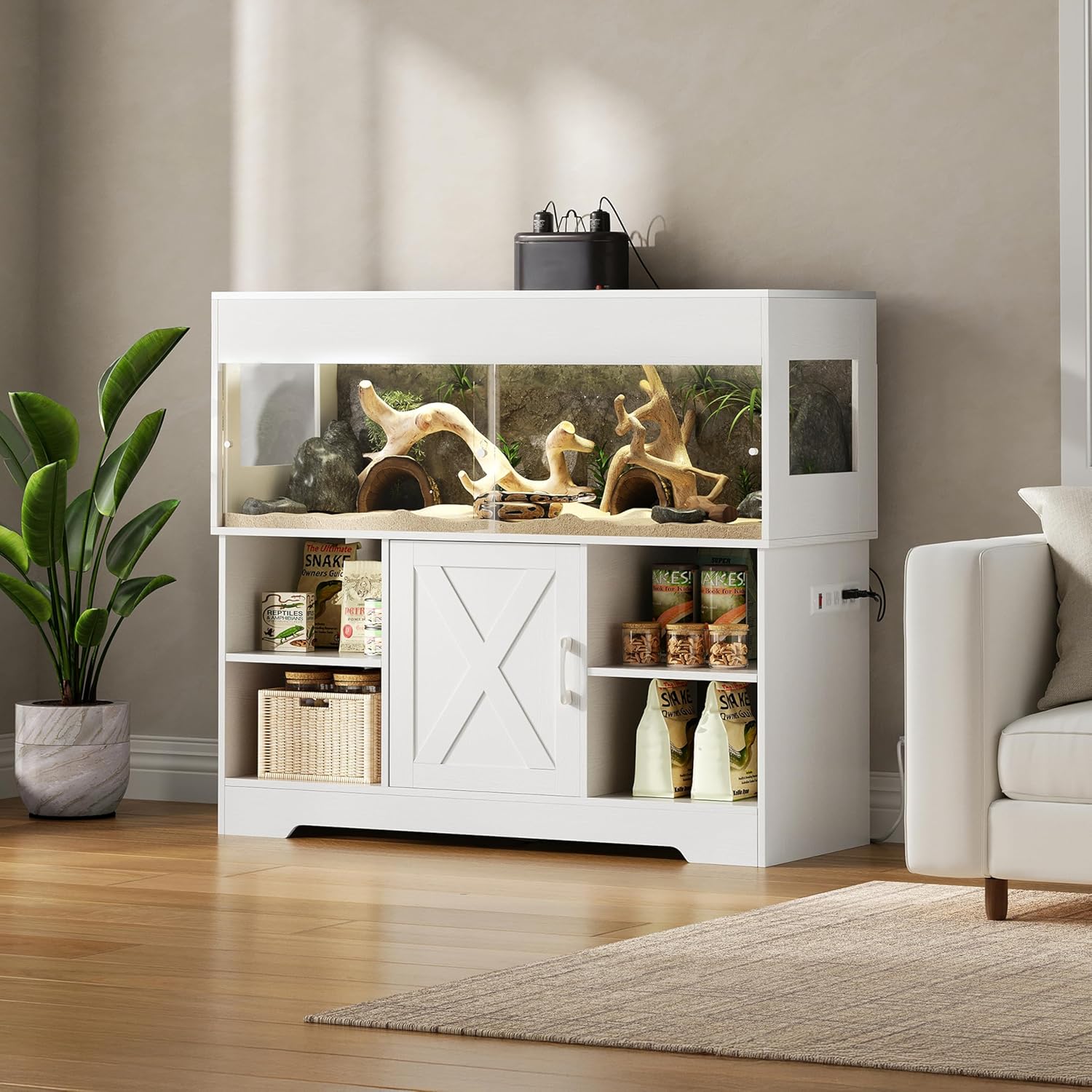 60 Gallon Reptile Tank with Stand, Terrarium Tank with Storage Cabinet, for Lizards, Skinks, Snakes, Sliding Acrylic Doors, Mesh Top, Built-in Power Outlet White PX02RTW