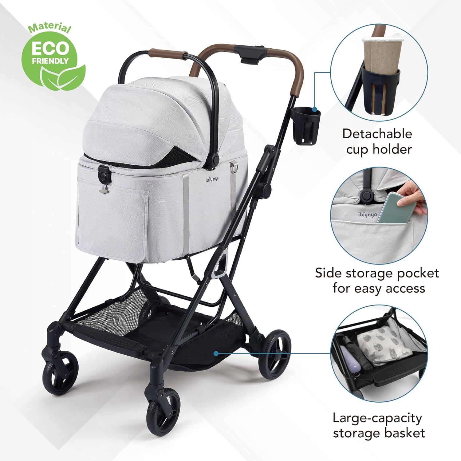 ibiyaya Tinker Pet Stroller for Small Dogs and Cats – 3-in-1 Pet Carrier, Dual-Opening Canopy, No-Flat Wheels, Vegan Leather Handle, Large Storage Basket (Silver Gray)