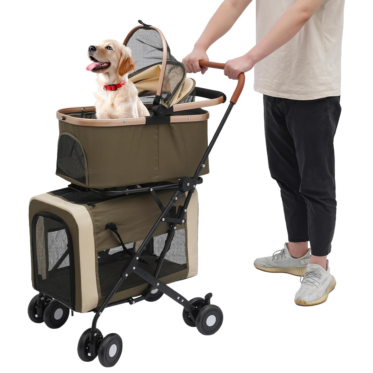 Double Pet Stroller with Detachable Carriers, Large Cat & Dog Stroller with 4 Wheels, Foldable Pet Strollers Small & Medium Dogs Cats 77lbs (Dark Green)