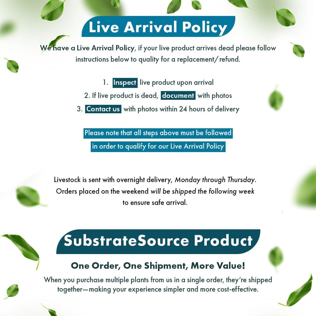 - SubstrateSource inspects each plant prior to shipping and ships all plants in healthy, stable condition with proper packing materials to ensure its safe arrival during shipping. Each plant is backed with a 100% dead-on-arrival replacement guarantee. To qualify, customers must provide a photo of the DOA plant within 24 hours of delivery.