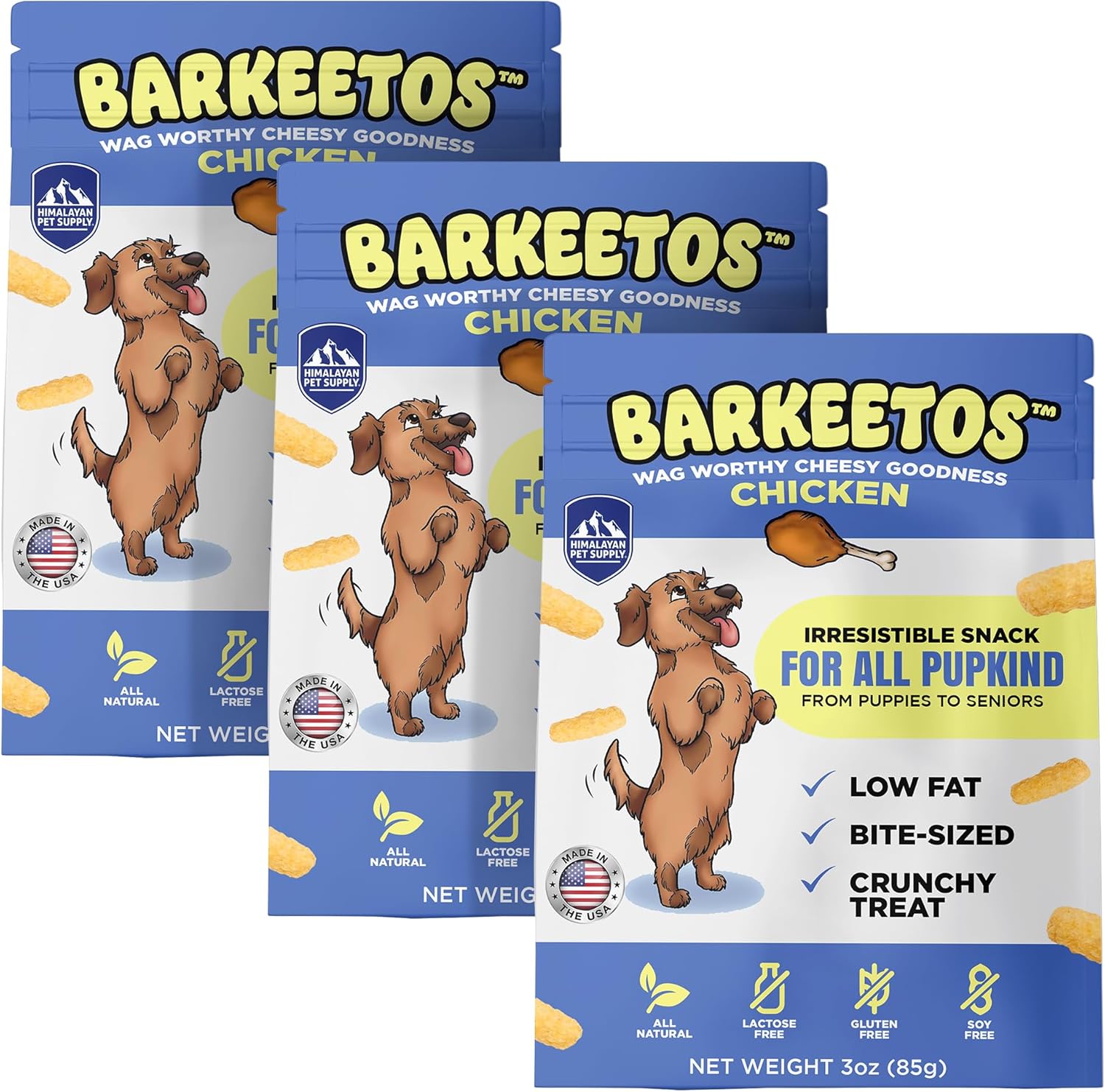 Barkeetos Dog Treats, Crunchy and Cheesy Pet Snacks Made with Real Himalayan Cheese & Chicken, Gluten Free, Grain Free, Lactose Free, Natural Dog Food for All Breeds and Sizes - 3 Pack