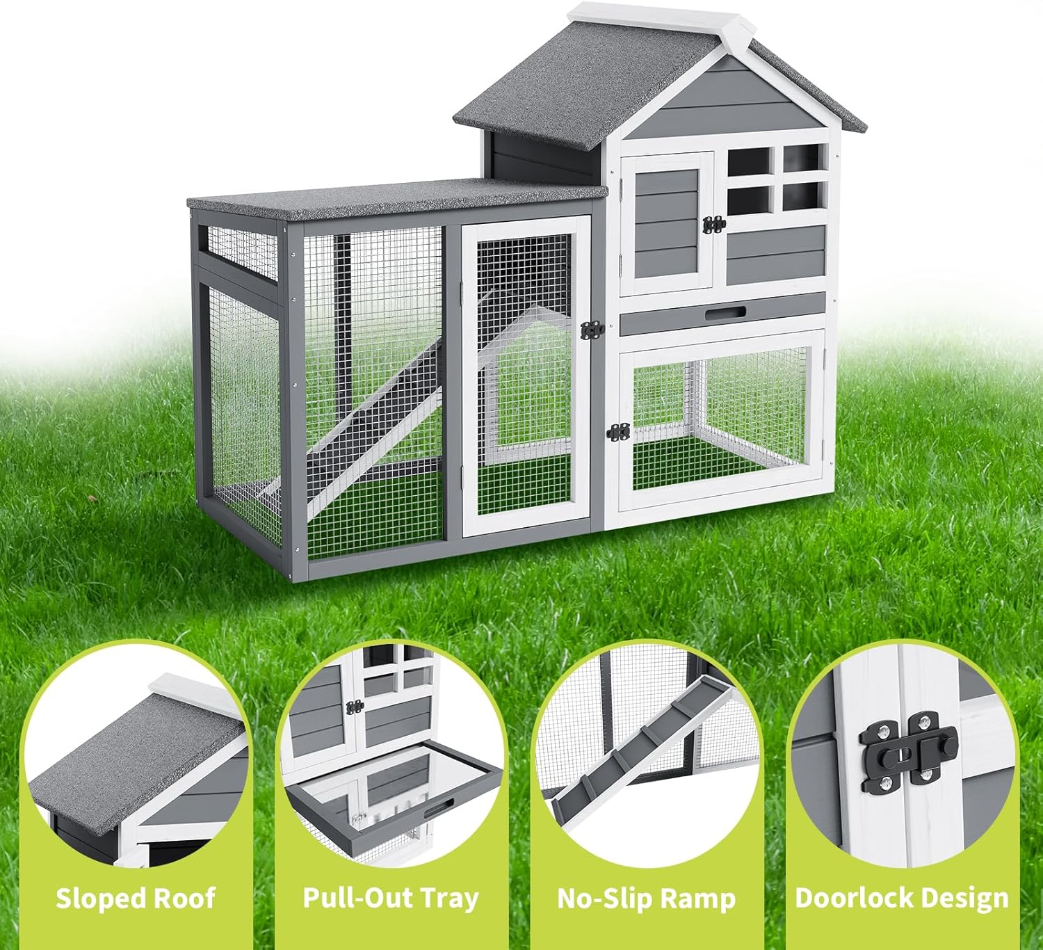 Rabbit Hutch 2-Tier, Small Wooden Chicken Coop for Outdoor Use - Weatherproof Small Animal Hutch with Non-Slip Ramp, 4 Access Doors & Removable Tray for Rabbits, Guinea Pigs, Ferrets (Indoor/Outdoor)