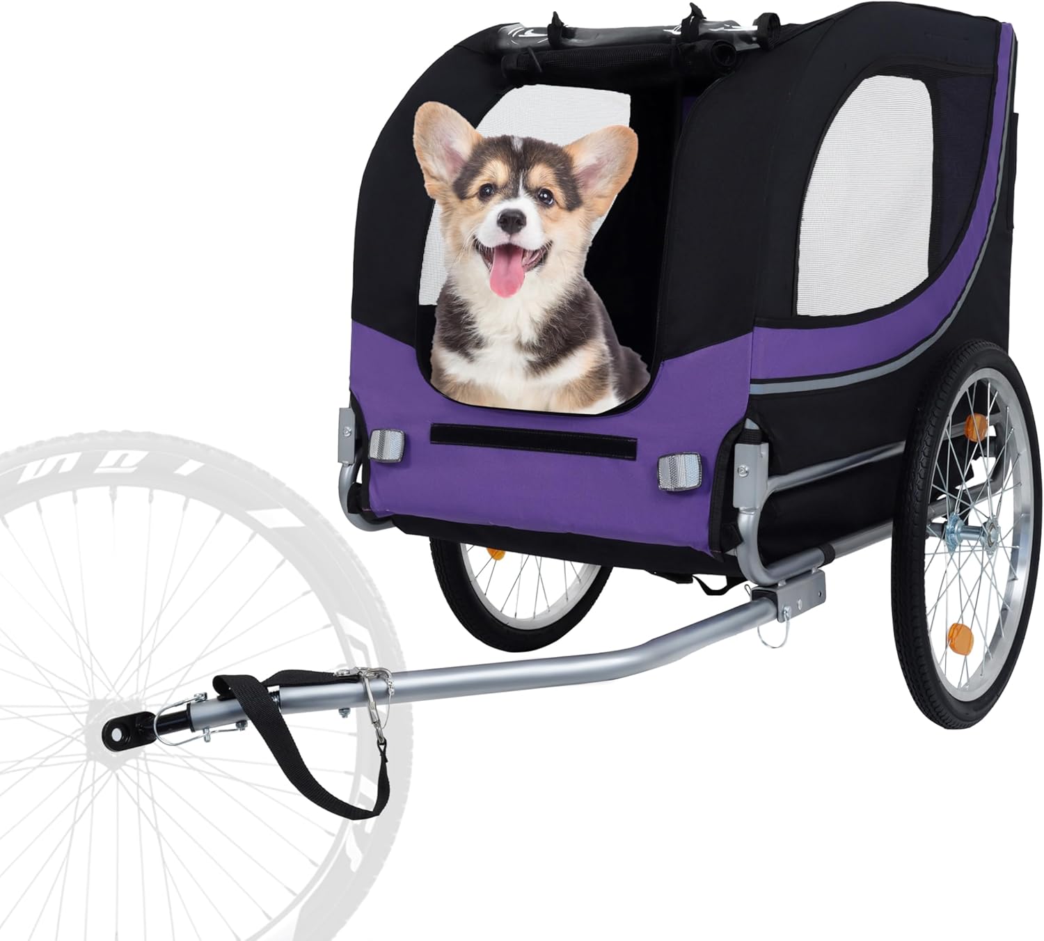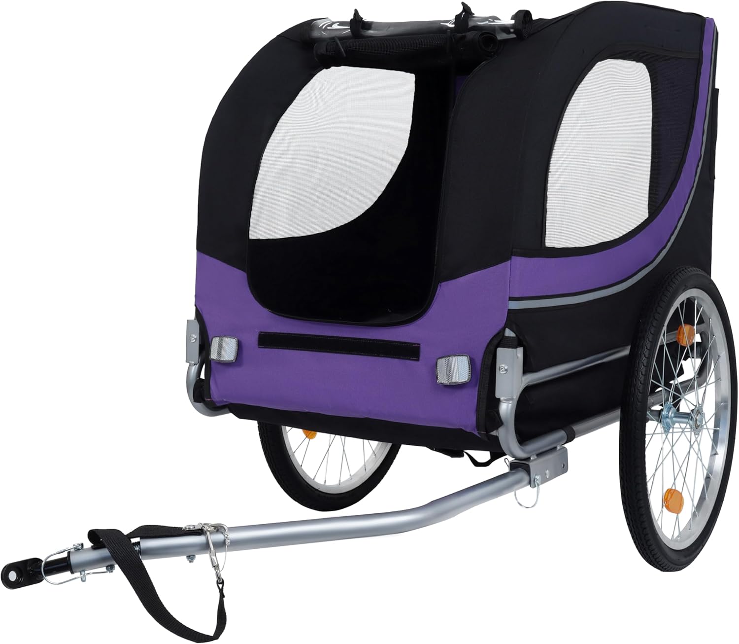- Trendy Color Combination: Available in a fashionable Purple and Black color scheme, this dog bike trailer not only provides functionality but also style. Stand out while enjoying your cycling journey with your beloved pets in this eye-catching design.