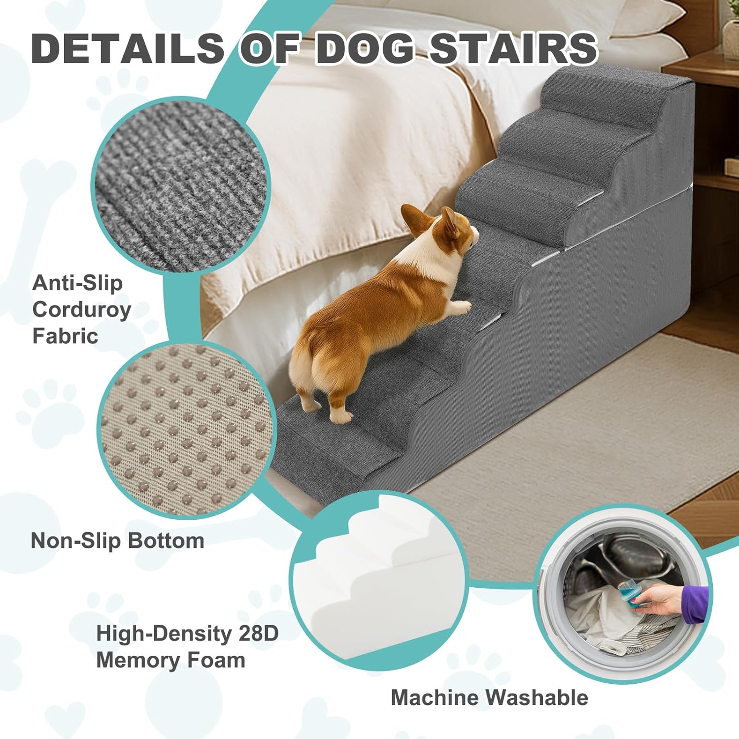 6-Step Dog Stairs for High Bed - 25.5" Adjustable Dog Ramps for Couch, Non-Slip Sturdy Pet Steps for Small Dogs, Washable Cover, Removable Modular Design, Dual 11” & 14.5” Steps for Custom Height