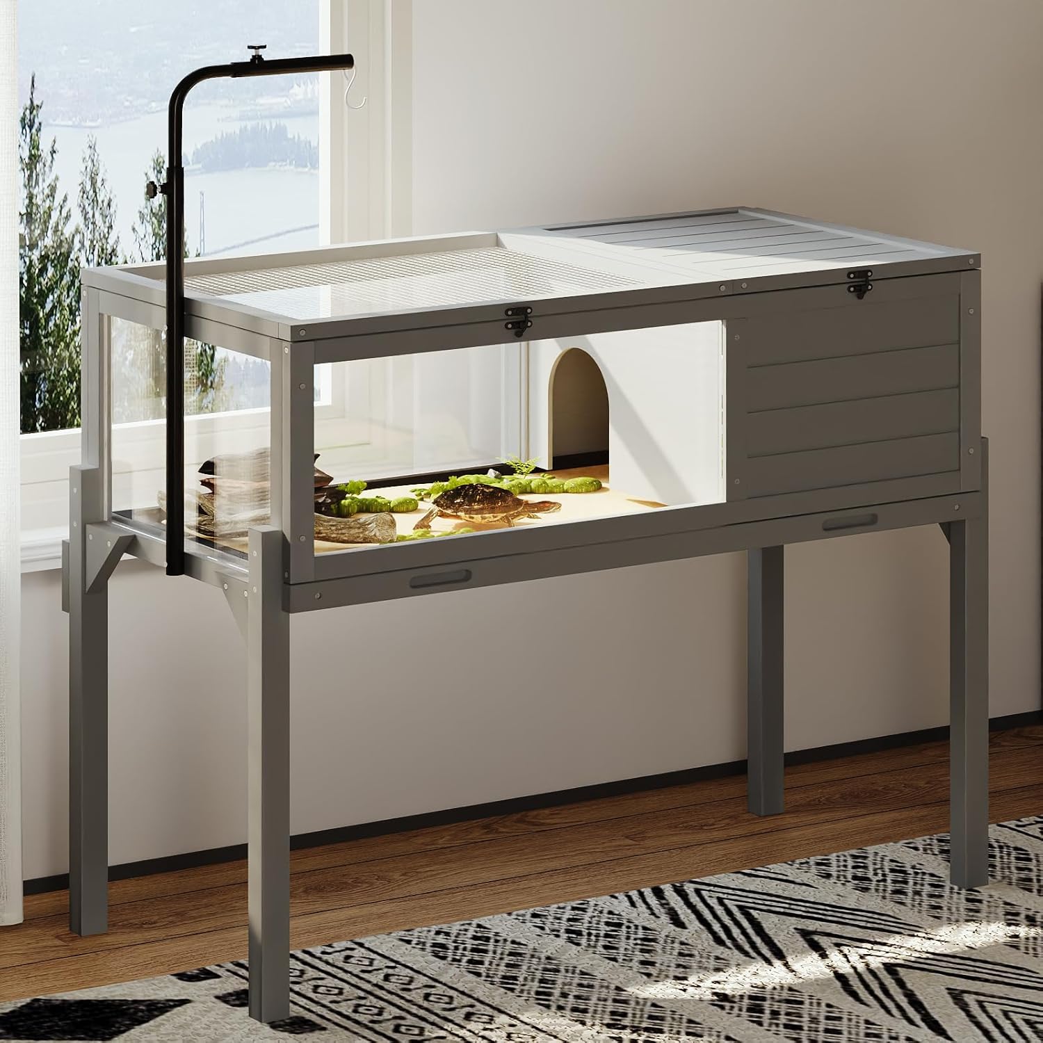 Tortoise Habitat with Adjustable Lamp Holder, Turtle Enclosure Indoor/Outdoor, Wooden House for Small Animals, Large Reptile Terrarium Table with Detachable Legs (New Gray)