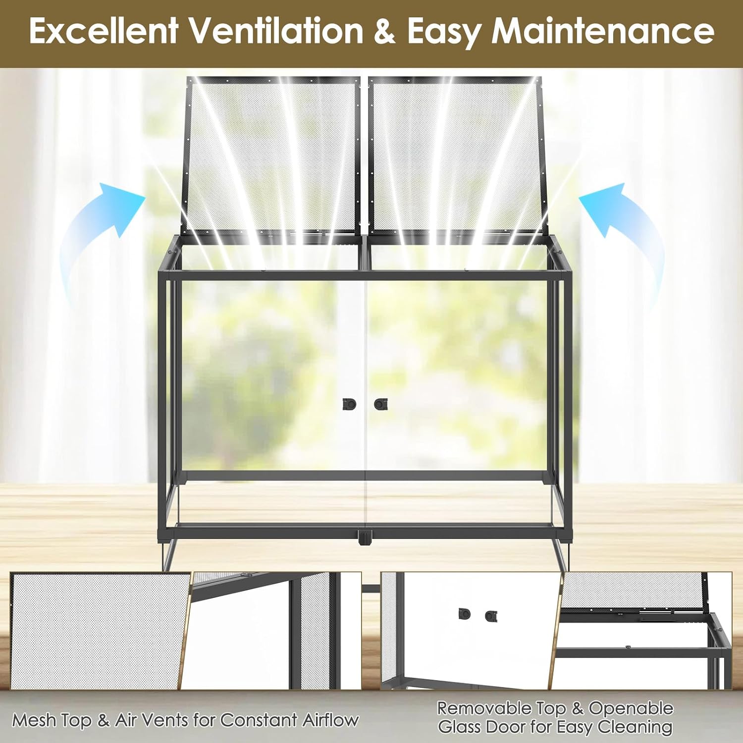 - Ventilated Design: Our reptile terrarium features interchangeable glass or mesh panels for rainforest or desert habitats, plus a mesh top and side vents for airflow. Removable lid and front-opening glass doors make feeding and cleaning simple