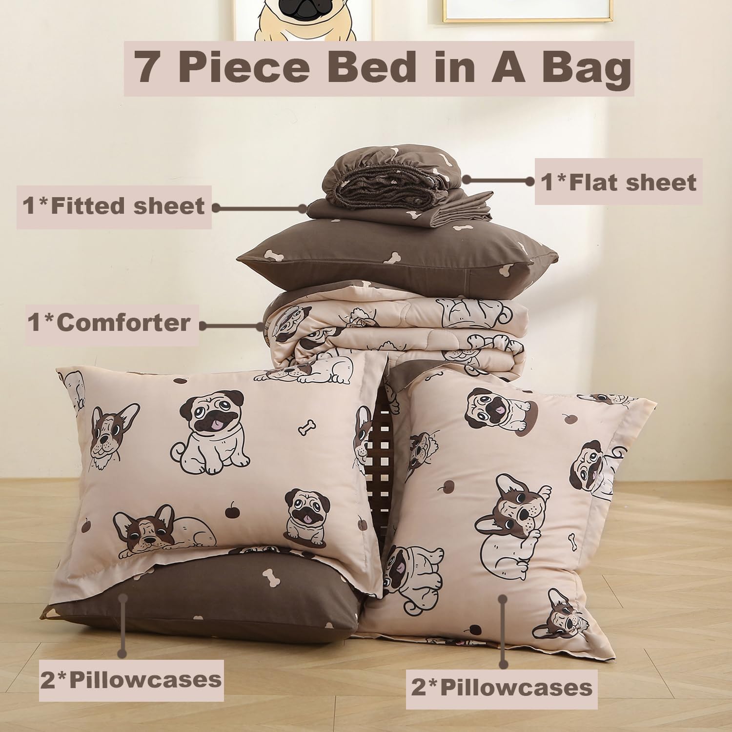 Kids Comforter Set 7 Piece Bedding Cute Dog Cartoon Animal Bed Microfiber Comforter Queen Size All Season (1 Comforter, 1 Flat Sheet, 1 Fitted Sheet, 4 Pillowcase)